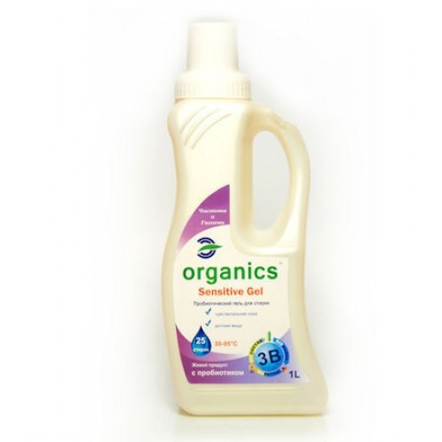 Oragnics Sensitive Gel - рідке пробиотическое засіб, яке виготовлено на основі мила і призначений для машинного й ручного прання. Концентрат не містить барвників, без запаху і без фосфатів. У його Склад входить рослинний бетаїн, який пом'якшує волокна тканини і сприяє повному вимивання миючих компонентів в процесі полоскання. Завдяки вищепереліченим властивостям концентрат Oragnics Sensitive Gel